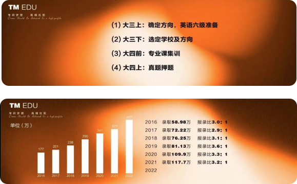 接着吴校长从近年来考研人数变化、考研专业国家线的数据,剖析了社会人文层面的各项原因,展示了每年考研人数递增、工作就业难的现状,而后吴校长揭示了考研录取率仅有3.2:1的数据,进一步向我们展现了残酷的考研战场。