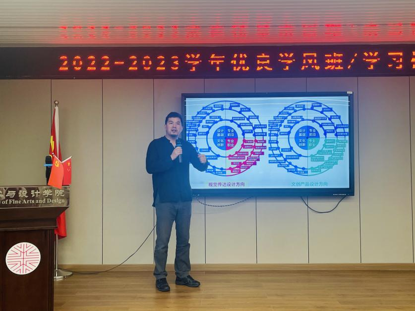 首先,刘俊老师给同学们详细讲解了视觉传达设计方向和文创产品设计方向的课程设置的异同点。介绍了这两个方向的专业课程设置和教学目标涵盖设计基础、品牌设计、文创设计、数字媒体四个课程模块的跨界整合教学培养体系,培养具有开放、多维、动态的创造性思维方式。