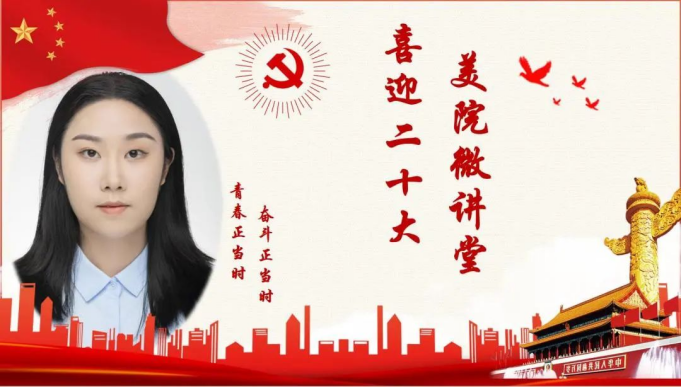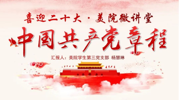 本期“喜迎二十大 美院微讲堂”活动由温大美院学生党员杨慧琳进行宣讲,带领大家学习党章的基本内容。党的第十九次全国代表大会,对中国共产党章程又做了多方面的重要修改。主要是体现了十八大以来马克思主义中国化的最新发展成果,体现了以习近平同志为核心的党中央治国理政新理念新思想新战略,体现了坚持和加强党的领导、全面从严治党的经验。