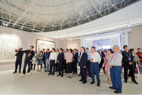 仪式结束,领导、嘉宾、校友、师生共同进入美术馆参观作品展。本次展览分为“先贤风雅”“同道传薪”两大板块,共展出了156位先贤、名家、教师和校友作品,涵盖国画、油画、版画、水彩画、综合绘画、书法、篆刻等种类。展览基于近现代中国美育运动、美术创作的宏大背景,对近代以来温州的书画创作与教育做一个初步的回溯,以近代几位具有代表性的书画大家与“美育大先生”开篇,延伸至温州区域美术创作,以及当代在全国卓有影响的重彩工笔画、书法、版画、水彩画的温籍代表作者;同时梳理学校的美育脉络,展示几代温大人的书画创作,弘扬与传播ylzzcom永利总站线路检测的人文风采。