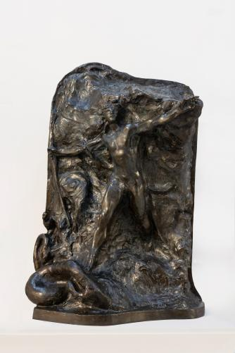 1895年,罗丹受邀为阿根廷第七任总统兼记者和历史学家多明戈·萨米恩托(Domingo Faustino Sarmiento)设计纪念雕像,这里展出的雕塑用于该纪念碑的底座,雕像于 1900年在布宜诺斯艾利斯揭幕。和南希的“洛林的克劳德”等纪念雕像一样,上方的人物雕像用青铜浇铸(铸铜商为Leblanc-Barbedienne),而下方的底座用大理石雕刻。罗丹在浅浮雕中用了位于“地狱之门”右侧倒挂姿势的众神使者墨丘利,但和“地狱之门”中的墨丘利不同的是,浅浮雕中的墨丘利是站姿,且头像换成了披着长发的卡米耶·克劳岱尔。这是罗丹经常使用此前雕塑来创作新雕塑的又一个例证。这个浮雕的灵感来自希腊神话,其中的巨蟒其实是守卫德尔斐神谕的巨龙。阿波罗杀死巨蟒后,得到了德尔斐神谕的管理权,获得了德尔斐神殿祭司称号。雕塑中阿波罗向前迈出右腿,右脚压住巨蟒,双臂张开,做出胜利的姿态,象征着力量,散发出骄傲的神情。