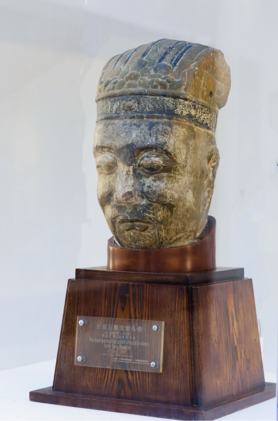 《唐代文官石雕》经专家鉴定大约雕刻于公元618年—713年之间,正好处在我国初唐时期,距今已有1300多年的历史。初唐时期的石雕,尺寸普遍很大,风格雄健有力,人物石雕造型特点包括人物的头部基本上呈现长方形,无论是人物还是动物,其方正之态大于圆润之姿,整体安定沉稳,此雕刻虽仅存头部,但是以仰视的角度从四十五度角进行观看时,仍可以感受到这个石雕头像的伟岸,头像整体轮廓造型正是非常标准的长方形,符合初唐时期的人物石雕特点。从头部的大小比例推断来看,整个雕塑的尺寸约有250厘米的高度。此件雕刻手法娴熟,风格一改北朝时期“秀骨清像”,面部饱满,气质浑厚,且整体安定沉稳,堪称唐陵石刻的典范。