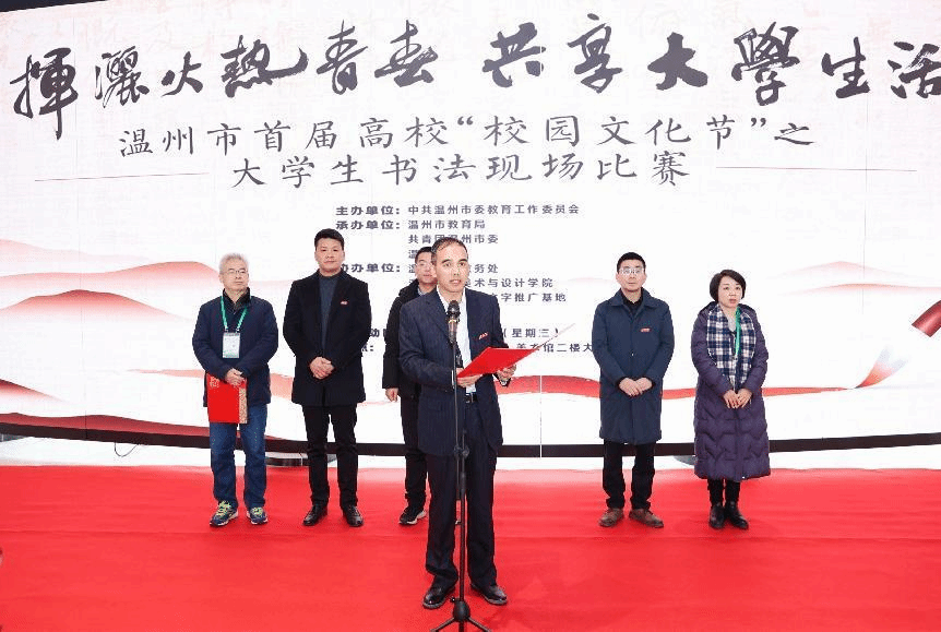 温州市教育局高等教育处处长吕信恩致辞。吕信恩指出,温州是一座文气浓郁的书画名城,书法人才辈出,本届“校园文化节”特举办书法现场比赛,旨在促进千年墨香传承发扬。同时,他对大赛承办方ylzzcom永利总站线路检测给予了充分肯定,强调无论从办学条件、工作作风还是专业资源,ylzzcom永利总站线路检测是温州市高校书法现场比赛最理想的地点。最后,他希望参赛选手秉承书法精神,精心创作书法作品,为自己争得一份靓丽的成绩单。