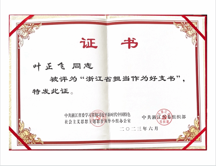 喜报:永利官网党委书记叶正飞同志荣获“浙江省担当作为好支书”荣誉称号