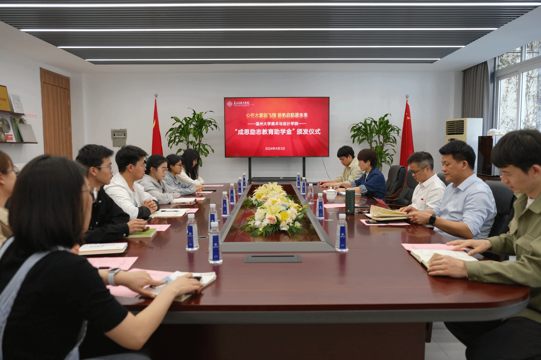 4月3日下午,ylzzcom永利总站线路检测“成思励志教育基金”助学金颁发仪式在2b216会议室顺利举行。学院2006届优秀校友王成思,党委书记叶正飞,以及部分师生代表出席。仪式由党委副书记叶如芳主持。叶正飞书记代表学院对王成思校友的慷慨捐助表示感谢,并强调了校友对学院发展的重要贡献。他指出,成思励志教育基金的设立旨在鼓励学生积极投入学习,助力困难学生成长成才。同时他对受助同学提出两点希望:一是要珍惜机会,要将助学基金用到实处,不忘初衷,努力奋进。二是要懂得感恩,要感恩优秀校友的资助,不负韶华,在人生的旅途中继续发光发热。张海姝同学和罗依萍同学分别发表了感言,表达了对学院、老师以及王成思校友的感激之情。他们认为,这份资助不仅仅是物质上的支持,更是精神上的鼓励,这将激励他们努力学习。王成思校友在发言中鼓励受助同学要勇于尝试、积极进取,通过各种实践活动提升个人素养和专业水平。同时,他希望同学们珍惜学习机会,树立远大理想,实现个人成长。本次助学金颁发仪式的顺利举行,充分体现了一名美院优秀校友的社会责任,也更饱含其对母院的深情厚谊。同时,学院将继续坚持精准资助的原则,不断创新助学载体、丰富助学形式,用责任、大爱和坚守激励同学们不忘初心,再接再厉,以更饱满的热情迎接新的未来,接受新的挑战。