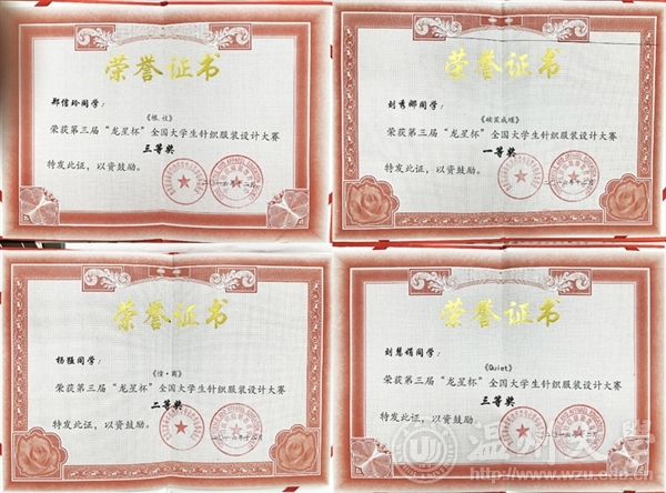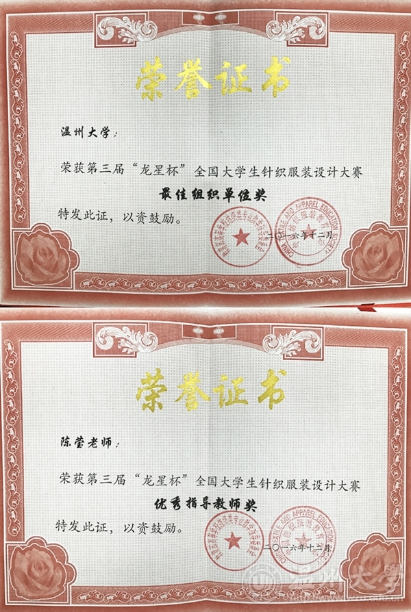 2016年12月30日,由教育部高等学校纺织类专业教学指导委员会和中国纺织服装教育学会主办的第三届“龙星杯”全国大学生针织服装设计大赛,颁奖典礼在东华大学举行。永利官网服装专业学子在赛事中斩获包括一、二等奖在内的六个奖项,ylzzcom永利总站线路检测获优秀组织奖,陈莹老师获优秀指导教师。