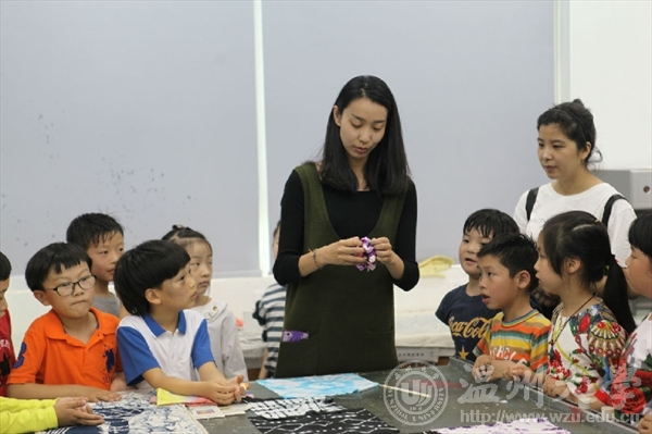 杨老师向大家介绍了ylzzcom永利总站线路检测美术学院印染实验室。张老师向家长孩子们介绍了“扎染”的发展历史,展示了五颜六色的扎染成品。孩子们都全神贯注的看着,还积极的向老师询问扎染的方法。扎染古称扎缬、绞缬、夹缬和染缬,是中国民间传统而独特的染色工艺。 其工艺特点是用线在被印染的织物打绞成结后,再进行印染,然后把打绞成结的线拆除的一种印染技术。它晕色丰富,变化自然,趣味无穷。更使人惊奇的是扎结每种花,即使有成千上万朵,染出后却不会有相同的出现。这种独特的艺术效果,是机械印染工艺难以达到的。