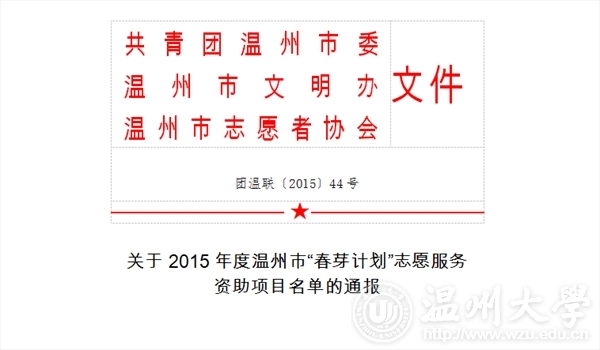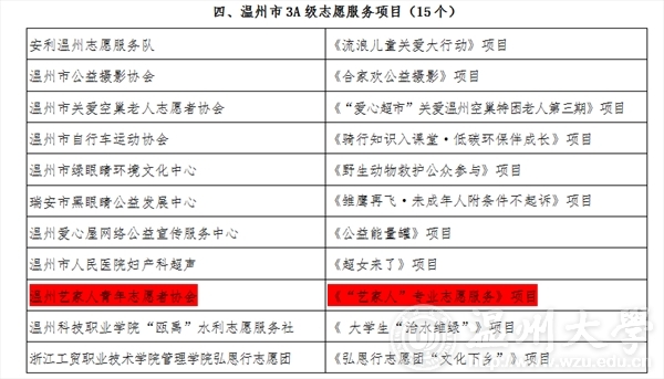 2015年12月12日,在温州市“春芽计划”志愿服务资助项目名单上,ylzzcom永利总站线路检测“艺家人”青年志愿者协会荣获ylzzcom永利总站线路检测唯一一个3A级项目,即温州市“春芽计划”3A级志愿者服务项目。