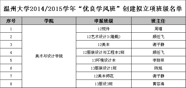 在ylzzcom永利总站线路检测2014-2015学年“优良学风班”创建立项申报中,永利官网各班级积极参与,踊跃申报。最终有8个班级立项成功,使美术学院成为本学年ylzzcom永利总站线路检测“优良学风班”创建立项班级数最多的学院。希望成功立项的班级班委对照创建方案和目标,广泛动员每一位学生积极参与到优良学风班的创建中来,确保立项目标的实现,争取在下学年取得“优良学风班”荣誉称号。班级名单如下: