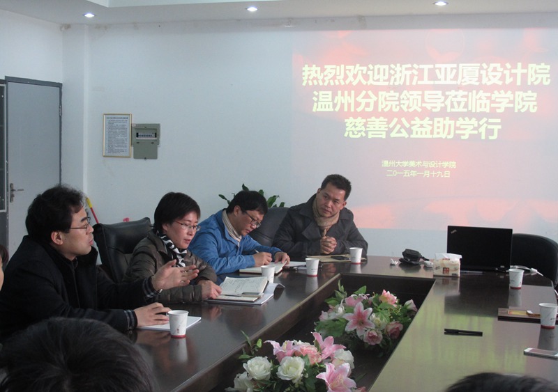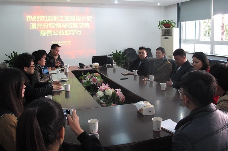 ylzzcom永利总站线路检测自2014年4月与亚厦温州设计院签定合作协议以来,双方在项目教学、实习就业、人才培养等方面开展了深入的合作。近日学院王剑峰同学在亚厦温州设计院实习,表现优秀!不料其父亲因意外出车祸并未找到肇事者,高额的医疗费让这个普通的家庭陷入困境。当亚厦院长慈善基金会秘书处得知这一消息后,提议首次启动“院长慈善公益基金会”。1月19日上午,“亚厦院长慈善公益基金会”胡逸理事长、梅笑天副理事长、胡世列常务理事等一行来到ylzzcom永利总站线路检测开展慈善公益助学活动,捐赠一万元爱心款帮助这个普通家庭慢慢走出困境!传递出设计院全体同仁的浓浓爱心和关怀!出席仪式的有学院李运河院长、郑彩莲书记、杨振海副书记、办公室李丽主任、设计系朱广宇主任、学生科叶如芳科长以及在亚厦温州设计院实习的11环艺班的同学代表。杨振海副书记主持仪式。