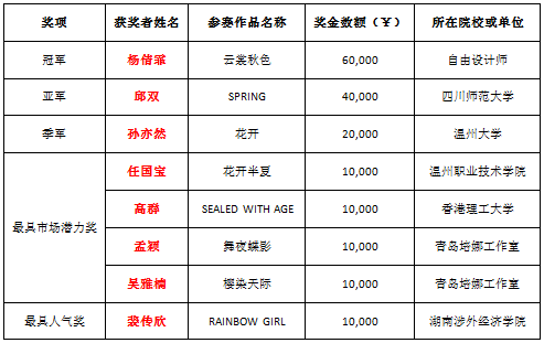 经过紧张激烈的竞逐,世界彩虹•首届卓多姿时尚女装设计大赛总决赛的结果终于诞生!来自湖南涉外经济学院的16号选手裴传欣力压群芳,获得奖金为一万元人民币的“最佳人气奖”。来自浙江温州职业技术学院的04号选手任国宝、来自香港理工大学的06号选手高群、来自山东青岛培娜工作室的09号选手孟颖和011号选手吴雅楠获得奖金各为一万元的“最具市场潜力奖”。季军则被来自ylzzcom永利总站线路检测的05号选手孙亦然摘得,奖金两万元。亚军归属来自四川师范大学服装学院的03号选手邱双,奖金四万元。最后,刘亦菲再度登台,与中山市卓多姿服饰有限公司总经理、艺术总监吴肖玲女士一同揭晓冠军得主并颁奖:来自广西的自由设计师、01号选手杨倩霏摘得桂冠,捧走六万元的奖金!