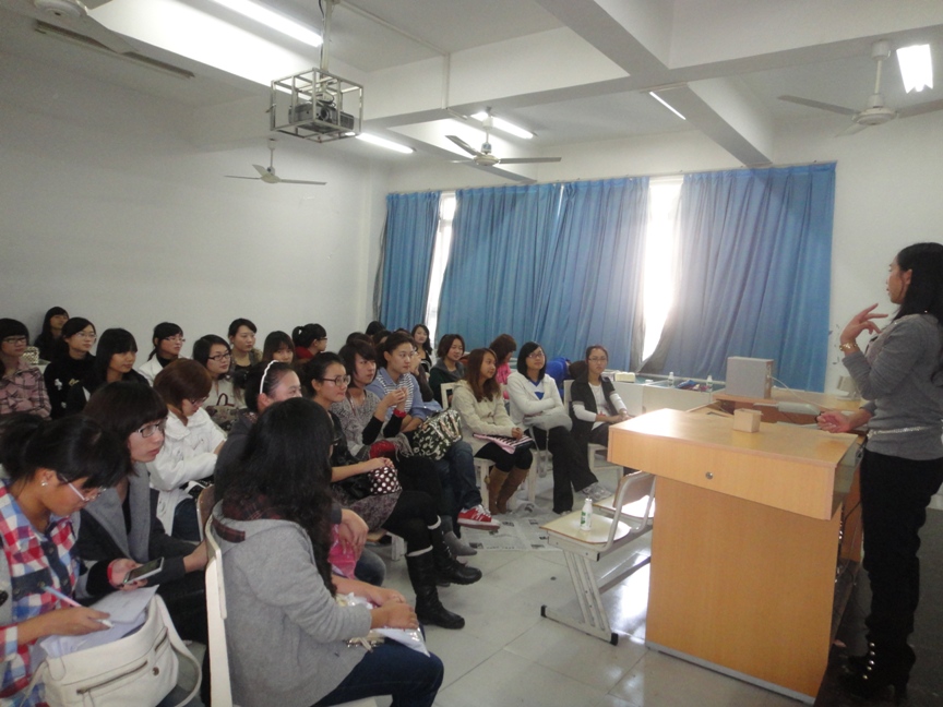 2010年11月20日星期六14:00~16:00,在美院2B3001,雪思美容院院长、医学院WinGirl俱乐部指导老师朱来顺,为永利官网的化妆培训素质拓展班画上一个完美的句号。 此次培训是朱老师在本学期第四次给大家辅导。其热烈的掌声,阐释着大家对本次培训的渴求和对朱来顺老师的喜爱。朱老师说,化妆是艺术。她要求人们在化妆之前先了解自己今天穿了怎样的服装,代表着怎样的形象以及自己的性格;希望每个人能了解自己面部的优点和缺点各是什么。然后,她让同学来当模特,一步一步地教同学们怎么样打底、修眉、调肤色、画眼线、眼影、腮红和唇彩。而同学们也是热情高涨,积极提问,踊跃参与其中。在示范的过程中,她也再三强调该注意的地方。比如定妆时要用散粉,补妆时要用粉饼,刷子半年洗一次,而在平时,只要用散粉洗就可以了……示范结束后,她则让同学们自己亲手实践。 这次培训,不仅让爱美的女生体验到了化妆带给她们在外表上的飞跃,更是让她们学习到了化妆的真正技巧。