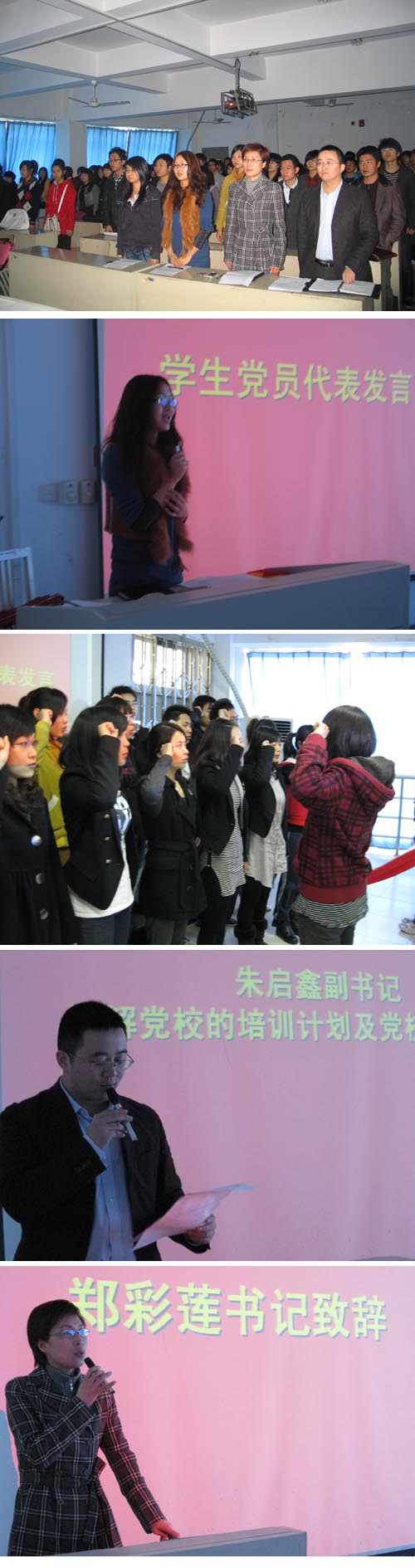 近日,ylzzcom永利总站线路检测第十二期业余党校在学院党总支的高度重视和关心下,顺利开班。本期党校学生报名踊跃,经过筛选,共85位学生光荣的成为了本期党校学员。 2010年4月9日,ylzzcom永利总站线路检测第十二期业余分党校开学典礼在美术楼2A308隆重举行。学院党总支书记郑彩莲、副书记朱启鑫,各学生党支部书记、学生党员代表及分党校学员等100余人参加了此次开班典礼。仪式由徐聿淼老师主持。 庄严的国歌声后,学生党员代表尹慧纯同学介绍了自身发展的经历,她勉励学弟学妹们要积极地向党组织靠拢,努力学习,提高自身各方面的知识和水平,争取早日加入党组织。学员代表学员发言。表示一定会认真学习好党的知识和精神,一定不会辜负党组织对他们的寄予和期望,一定会用实际行动证明他们是优秀的,为学院的发展贡献自己的一份力量。 郑彩莲书记代表学院党总支对能参加本次业余党校的同学表示祝贺,同时希望大家能认真对待本次机会,努力学习,争取能以优异的成绩向党组织汇报。并对学员提出三点希望。首先希望学员能通过学习,加深对党组织的认识;其次,她希望学员能持之以恒,通过自己的实际行动,处处体现先锋模范作用。最后,她希望全体学员能在党校的学习中,遵守纪律,认真学习,争取早日在思想上入党进而在组织上入党,并预祝本次培训班取得圆满成功。 学院党总支副书记朱启鑫就本期党校学习计划、学习要求等做了安排。班主任李剑军老师宣布了班委组成成员,并就分党校的有关规章制度作了详细的说明。 最后,在开学典礼上学院32名新学生党员在徐聿淼老师的带领下庄严宣誓,表达了对党的忠诚以及为共产主义事业奋斗终身的决心。这种庄严、激情的气氛深深地感染了党校学员们。 据悉,本次业余党校在1个多月的时间里通过理论学习、观看红色影像、分组讨论、辅导报告等理论与实践相结合的方式学习党的知识。
