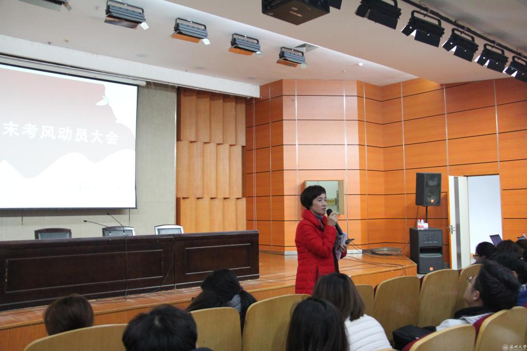 张丽萍书记在动员讲话中重申了考风考纪的重要性和作弊的危害性,她强调学习在于平时的点滴积累,来不得弄虚作假,作弊不能弥补学习上的漏洞,而是一种自欺人人的行为。张丽萍书记还鼓励同学们认真备考,争取考出好成绩。她强调:“大学里的每一次考试都是接受考核认证自我的途径,加强考风建设营造公平的考试氛围,既是每个同学的愿望也是每个同学应该肩负的责任。所以希望同学们在这次考试中能诚信做人,亮出真实的成绩,展现真实的自己。”杨振海副书记根据学生手册相关条例告诫同学们一定不能碰这个底线,在考试过程中不仅仅要交出反映专业知识水平的考卷,更重要的是在考试中要交出诚信的品行之卷。