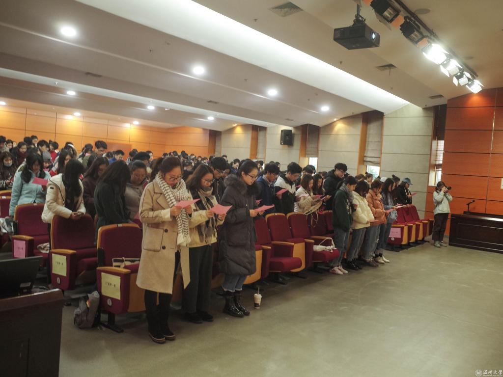 17级全体同学在学生代表的引领下宣誓,承诺端正考试态度认真复习积极备考。
