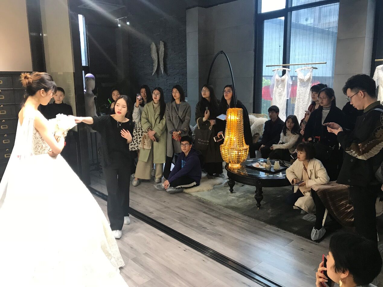 温州市鹿城区五马嫁依工坊婚纱店,是ylzzcom永利总站线路检测的校企合作定点单位,自2004年创立至今,已与国内外二十多家知名婚纱品牌合作,让臻美的大牌婚纱落地温州,为新娘带来了与国际结轨的尊享体验。此次我们参观的是2016年嫁依工坊新入驻米房开设的玩味定制婚纱体验馆“JOINFINE+”。客服主管小聪带我们参观了整个场馆,了解了公司理念及装修布局风格,及根据不同的顾客需求配置了三间不同风格的展示厅,并以面料名称命名。销售总监精心挑选了目前最新款、最具代表性的五件婚礼服给同学们进行了展示讲解。大家针对礼服的设计、面料、工艺、装饰、色彩、市场定位等专业问题展开了热烈的讨论与交流。