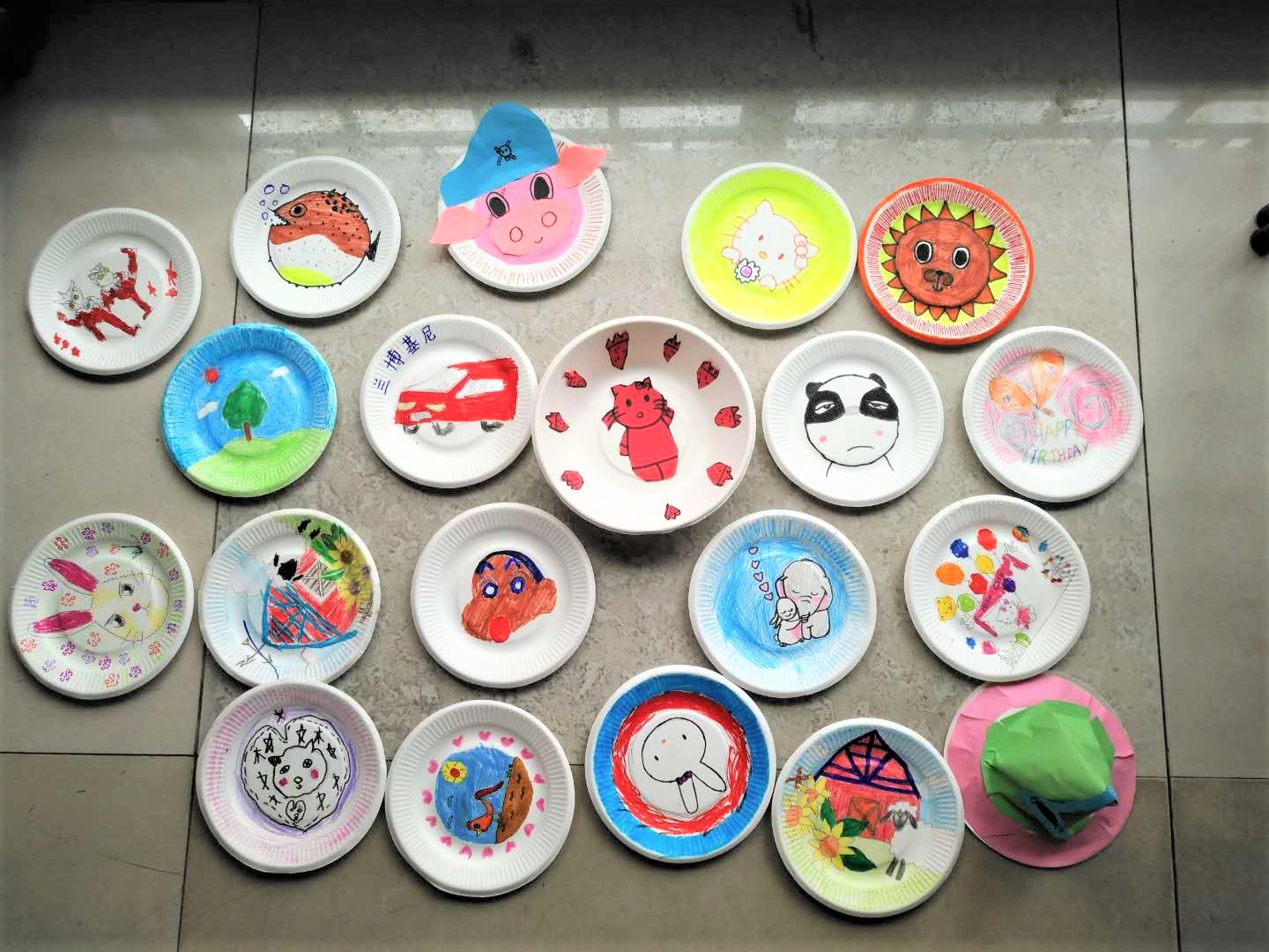 活动刚一开始,小朋友们就按耐不住了,立刻发挥自己丰富的想象力拿起五彩画笔在盘子上作画,有的还拿起剪刀裁出小动物的剪纸图案,不一会儿,通过铅笔的构形,橡皮的修改,颜料的上色等几个步骤,再加上画出的小猫咪,大熊猫,恐龙,蜡笔小新等等五花八门的图案,以及剪出的恐龙的小翅膀,猫咪的小尾巴,大熊猫的耳朵剪纸图案,所有的元素组合在一起,一个个可爱的盘子就呈现在眼前了,使人眼前一亮!纸盘上的小动物似乎富有生命力一样,活泼可爱,摆在桌面上很是讨人喜欢!活动过程中,小朋友们还玩起了石头剪刀布的游戏,不经意间的小动作总会让大家开怀大笑。由笑声开始的活动,又将要在笑声中结束了,最后小朋友们一起拿着自己的作品合影留念。