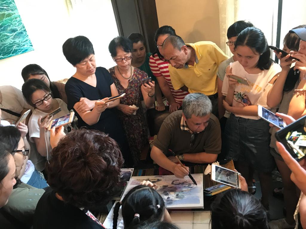 7月1日下午,在温州市图书馆朴念文化客厅“籀园讲坛”再次迎来ylzzcom永利总站线路检测由ylzzcom永利总站线路检测主办的“传统文化与时尚生活”系列主题之八“走近水彩,了解水彩,快乐水彩”讲座,讲座由ylzzcom永利总站线路检测李利民老师主讲。现场加座后仍座无虚席,李老师幽默风趣的演讲风格,观众的热情洋溢,使得现场氛围持续保持着热烈与活跃。 水彩,顾名思义,就是以水为媒介调和颜料作画的表现方式。那么,一幅有灵魂的水彩是怎样生成的呢?李利民老师不仅分享了自己的写生、创作经验及心得,例如作画技巧、风格调子的形成、画面处理等技巧,给大家带来很多干货;而且通过对水彩的生动讲解及阐述,以及现场动手边作画边讲解的方式,让我们对水彩有了更深的认识与理解。活动期间,读者朋友热情参与,现场互动与提问不断。由李老师亲笔签名的10份《李利民水彩画精选》作为随机抽奖奖品也为互动增添了热烈氛围。