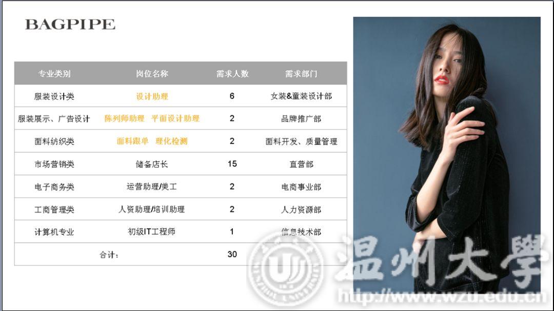 10日19日上午,Bagpipe风笛2019无限想象全国高校巡回宣讲会在美院顺利展开。在多年的合作与交流当中,风笛与温大也结下了不解的情缘。本次宣讲会有学院党总支副书记杨振海与风笛服饰有限公司经理吴朝晓莅临宣讲会现场。 首先是杨书记致开场词,在同学们热烈的掌声中,杨书记侃侃而谈。“温州风笛服饰有限公司与温大美院搭建了一个非常典型的校企合作平台,风笛公司作为我校省级校外实践教育中心,与永利官网在专业教学、实习实训、就业创业等领域开展全面战略合作,我们非常高兴看到风笛公司一直以来欣欣向荣的发展态势,也希望双方能携手结出更多合作成果。” “不忘初心,使命必达。”风笛宣讲人缪老师在分享风笛创始人创业史、发展史,讲述风笛的过去、现在与未来,同学们都听的津津有味。宣讲会在主持人和同学们的互动中开始后,主持人分别从公司品牌设计风格,员工的衣食住行娱,薪资问题和管培生培养计划等几个同学们关心的方面来介绍风笛服饰有限公司的细节。BAGPIPE风笛成立于1999年,是一家自主开发、生产、销售时尚女装和童装的品牌经营企业。风笛公司的女装品牌分为周末时尚,摩登帅气,精致优雅三个风格,而风笛公司的童装品牌的定位则是针对2-8周岁的儿童设计的,风格多样是风笛公司的优势所在。衣食住行方面,风笛公司也非常重视员工的感受,为他们提供了舒适的环境以便于员工们更好的工作和生活。同时,风笛公司也十分重视对人才的培养,也有一套完整的体系进行人才的引入。这便是风笛管培生培养计划的由来。对于进入风笛上班的应届生,风笛建立了完善的“管培生培养计划”,全面打造“一专多能”的复合型人才,让每个进入风笛的应届生迅速成长,成为独当一面的技术或管理人才。在经过由系统培训、店铺见习、核心轮岗和专岗实践四个环节的管培生培养计划之后,实习生便能更好地融入公司这个大集体。说到薪资方面的话题,风笛公司的PPT上有着这样一段话:“一个人,只有自己成长了,事业才会跟着成长。一个人,只有自身价值提升了,薪资岗位才能跟着提升。”从这段话中我们也可以清晰地看到风笛公司对人才和员工能力的重视。对于服装设计、服装展示、广告设计、面料纺织类的专业,风笛公司也提供了如设计助理、陈列师助理、平面设计助理、面料跟单、理化检测的专业让同学们选择,以便给予同学们更大的就业空间。 “风笛未来,无限可期。”这是这场宣讲会的结束语。无限可期的不仅是风笛的未来,也同样是我们美院同学们明媚的未来。正如主持人所说,人生不设限,未来就会精彩无限。我们也相信同学们在一番拼搏之后,会绽放出人生绚丽的芳华。