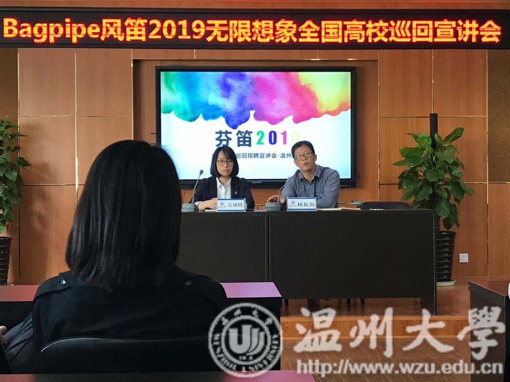 10日19日上午,Bagpipe风笛2019无限想象全国高校巡回宣讲会在美院顺利展开。在多年的合作与交流当中,风笛与温大也结下了不解的情缘。本次宣讲会有学院党总支副书记杨振海与风笛服饰有限公司经理吴朝晓莅临宣讲会现场。