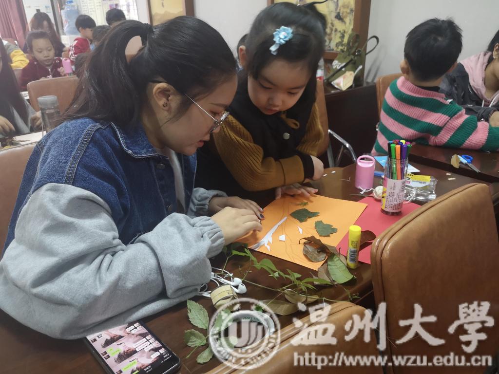12月1日,在这新的一月的第一天,又是一个周六,梅泉社区文化礼堂再度因美院“艺家人”志愿者的到来座无虚席。小朋友们在这里上课时都自然而然地与上几节课熟识的志愿者哥哥姐姐们结对坐下,静候今天的课程开始。 这堂课名为《秋天的故事》,讲课老师给小朋友们观看了一部有关秋天的动画作为开场动画。接着,讲解老师给小朋友们看了各种树叶的照片,有银杏叶,枫叶,香樟叶,梧桐叶;还有各种创意的树叶组成的作品,有用树叶重组大树的,有用树叶拼成小人的,有用树叶摆成太阳花的,还有用树叶做成一个花园的。老师带领着小朋友们领略了地上随处可以捡到的落叶也能做成美丽的创意图画之后,着实是点燃起了小朋友们创作的热情和欲望。照例的,志愿者哥哥姐姐们开始分发彩纸,勾线笔,水彩笔,剪刀,胶棒等工具。特别的是,这一次还有纯天然野外收集的各类落叶,被清理干净新鲜的分发到小朋友们的桌上。小朋友们开始大展身手了:首先,和哥哥姐姐们商讨构思;然后在卡纸上打草稿;接着开始利用剪刀动手制作树叶使它们变成心里所想的模样;再利用胶棒让它们都粘合再同一张卡纸上。一副秋天故事的景象就这样跃然纸上。小朋友们欣喜的拿着自己的作品来找摄影师姐姐要求拍照留念。课堂尾声,屏幕上放映起了有趣的动画视频。合影留念毕,小朋友们帮助志愿者们归还、整理工具以及材料,然后将自己制作作品留下的垃圾扔进垃圾桶,给这次活动辛苦的志愿者们剩下了很多收拾的精力和时间,真是太懂事啦! 一周一次的课程到此就结束了,小朋友们带回了自己动手制作完成的“秋天的故事”,在冬日的暖阳之中回味着上一个季度,秋天的余韵。小朋友们触摸着卡纸上凹凸的叶片的纹路,那是绝美的自然的恩赐,是天造的艺术。他们怀揣着一颗感恩自然的心踏上了回家的路。