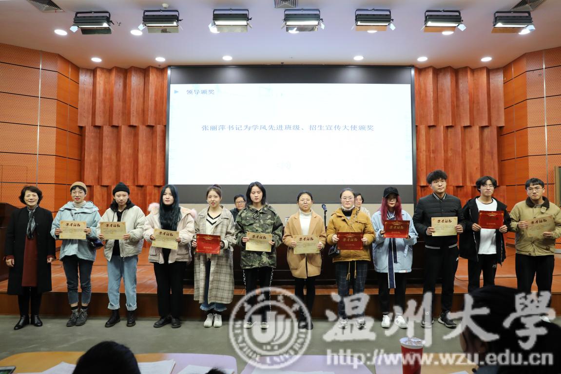 大会之初由学生科李雪涛老师汇报本学期学风考勤情况。李老师以年度数据、迟到数据、旷课数据、晚自习数据全面总结了本学期美院考风考勤情况。紧接会议进行第二项议程学风表彰。由学风纪检部部长宣读本学期优秀纪检委员、学风先进个人以及班级名单。接着,学生会主席陈晨宣读本学期招生宣传优秀宣传大使、艺术团优秀团员表彰决定。院领导为获奖同学颁奖以示鼓励。随后由全体学生宣读《诚信考试承诺书》并签字承诺。