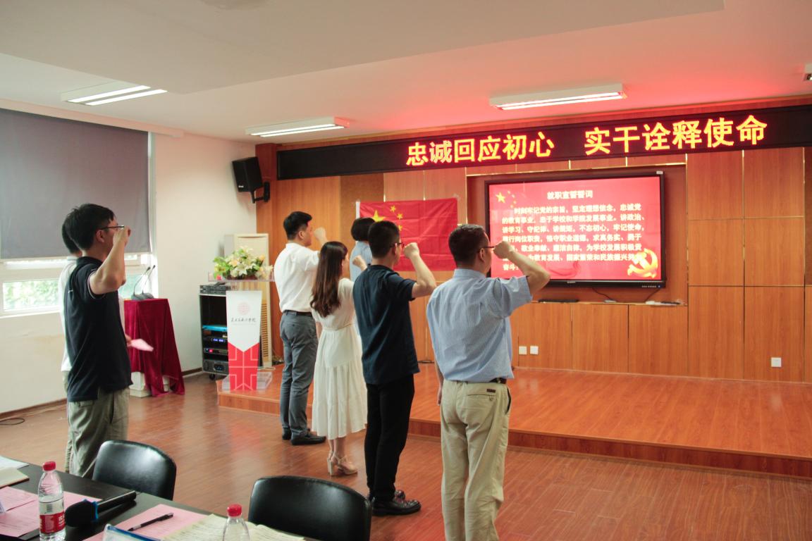 2019年7月7日下午15:30,ylzzcom永利总站线路检测党委为更好的贯彻落实学校党委关于“不忘初心跟党走,牢记使命勇担当“为主题深入开展“红七月·服务月”活动。学院党委深入开展“五带头”活动,带头寻初心,在学院2B4001举行了“忠诚回应初心 实干诠释使命”ylzzcom永利总站线路检测领导班子及科级干部重温入党誓词暨任职宣誓仪式。