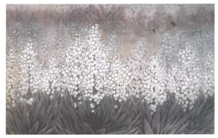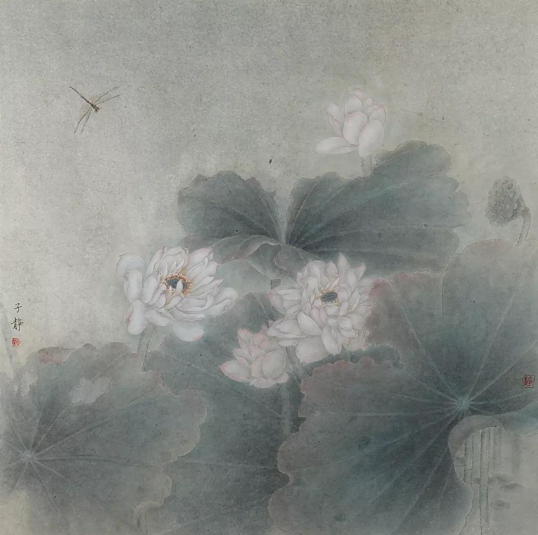 谢子静的作品以恬静、典雅、淳朴、淡泊为主旋律,而积极向上,热情乐观则是作品精神的内涵。在立意造景方面,看似寻常,但却能给人以无限遐想。如《秋露》图,画面右侧,一株强劲有力的剑麻直线挺然而立,远处数株风姿自然,并巧布在画面右侧以曲线多变的外形,构成一大空白。空白的一侧,隐藏着两只相依的禽鸟,使画面别开生面,既增添了联想的空间,又活跃了画面的气氛。意的妙趣,情的缠绵,赏之有回味,读之有余音。这种寻常的造景立意,能取得如此的艺术魅力,全在思维的敏捷,想象的豁达,虚实的巧布,笔墨的机灵。在构成布置方面,虽无惊险奇特之举,然而能让人感到平中有变、平中藏奇的感受。如《青剑》图,几株茁壮的剑麻平行直线排列,几只蜻蜓横向飞行,从画面构成来看,是一幅极为简单的纵横直线相交组合。由于平行中有耐人寻味的变化,交叉中有捉摸不定的穿插,在不经意中把那种朴实、纯洁、天然、自在的艺术情味表现得十分得体,给人以辽阔、深远、新奇、大气的美感。在设色方面,很少采用强烈夺目绚丽的色彩,而是以清淡典雅作为基调,于淡中求变化,淡中求韵味。刻意追求物象神质情态的表现,以达到最强度的艺术感染力。如《蒹葭苍苍》图,作品以平日里采风、写生途中所见的芦苇与嬉栖的白鹭为画材,旨在表现自然界动人和谐的一幕,寄寓着摆脱尘俗,融入超逸的自然景界,抒发了一种美好的心境。画风以宋明院体花鸟画之雍容谨严为典范,参以文人画逸笔的幽远意境与简澹设色,营造画者心中氤氲已久的古典幽梦。篇幅宏阔,意在改变历代花鸟画常见的小品格局,赋予作品以富有张力的现代视觉形式效果。如《荷风送香》图,整幅画面如同一曲抒情的轻音乐,使人沉浸而陶醉。青绿色的荷叶,在淡泊中见有沉甸厚重之感,叶面周边施以淡赭,不仅取得温柔的冷暖对比效果,也把荷叶的生态美表现得鲜活纯真。白色的荷花,着粉不滞板,恰到好处,把花瓣沉稳而透亮的质感表现得极为优美。月黄的莲蓬更是意气妖态,飘飘然而欲舞,默默然若移步,似有清香袭人,如临野塘晨风,水天一色,花草和谐,赏之悦目,,读之心怡。这种境界正是谢子静匠心用色所追求的艺术情趣。《传承.蜕变》是谢子静近期的创作作品,画面表现的是温州古戏台的一组组戏曲彩绘图饰,辅以吉祥纹饰。彩绘人物动态夸张、生动,线条运用娴熟、流畅,色彩斑驳、厚重,以传统的工笔重彩技法记载了温州戏曲文化与民俗文化。作者正以其特有的视角和方式关注温州戏曲文化遗产,倡导温州南戏的传承与蜕变。更有得一之想的是画面以一只飞鸟置于前景,将不同时期舞台的图饰作为背景,达到穿越时空的联想。以花鸟画的形式来表达戏曲的题材内容可能当属首次,这充分说明作者对事物观察的敏锐性和大胆创意的精神,关注其传承与蜕变。