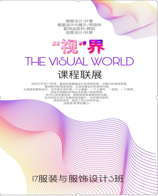 2020年11月30-12月8日,由叶茜老师、李勋祥老师、韩阳老师、叶婷老师指导的17服装与服饰设计3班橱窗设计课程、橱窗设计VR展示课程、配饰品陈列课程、创意设计课程四课程联展在ylzzcom永利总站线路检测教学楼一楼大厅展出。展出的一件件作品,不仅充分展现了班级同学的专业能力,而且有力体现了美院的艺术风采! 当你打开这个“视界”,看到的是橱窗设计的奇思妙想、VR展示的身临其境、配饰品陈列的视觉体验以及创意设计的各种可能...... 从思维创意到设计,也许是生活中某一个小画面、一个小摆件、一段话、一个表情......这些不经意的东西,往往会使人突发奇想,你可以将灵感迸发,再到体验亲身制作的过程。也许你在为设计实施而绞尽脑汁,也许想过放弃,但你依然坚持完成了你心中的作品,这就是“视界”的魅力。 此次展览一方面是为了向全学院展示我们陈列展示班级的学习成果,传播我们独特的课程文化;另一方面也是希望能与其他相关班级的同学老师们进行艺术交流,一同品味。 课程展出当天,引起了不少老师和同学们驻足,停下脚步欣赏的作品。通过这次课程展览,不仅仅让更多的同学们了解服装展示设计方向专业重要性、独特性、趣味性,也让大家都看到并认可同学们的专业能力和专业水平,更是提供了师生们互相交流的平台。同学们也因此领略到橱窗设计的魅力与理念,开阔了自己的眼界,欣赏了不同的课程文化。 (材料提供者:王欣雨)