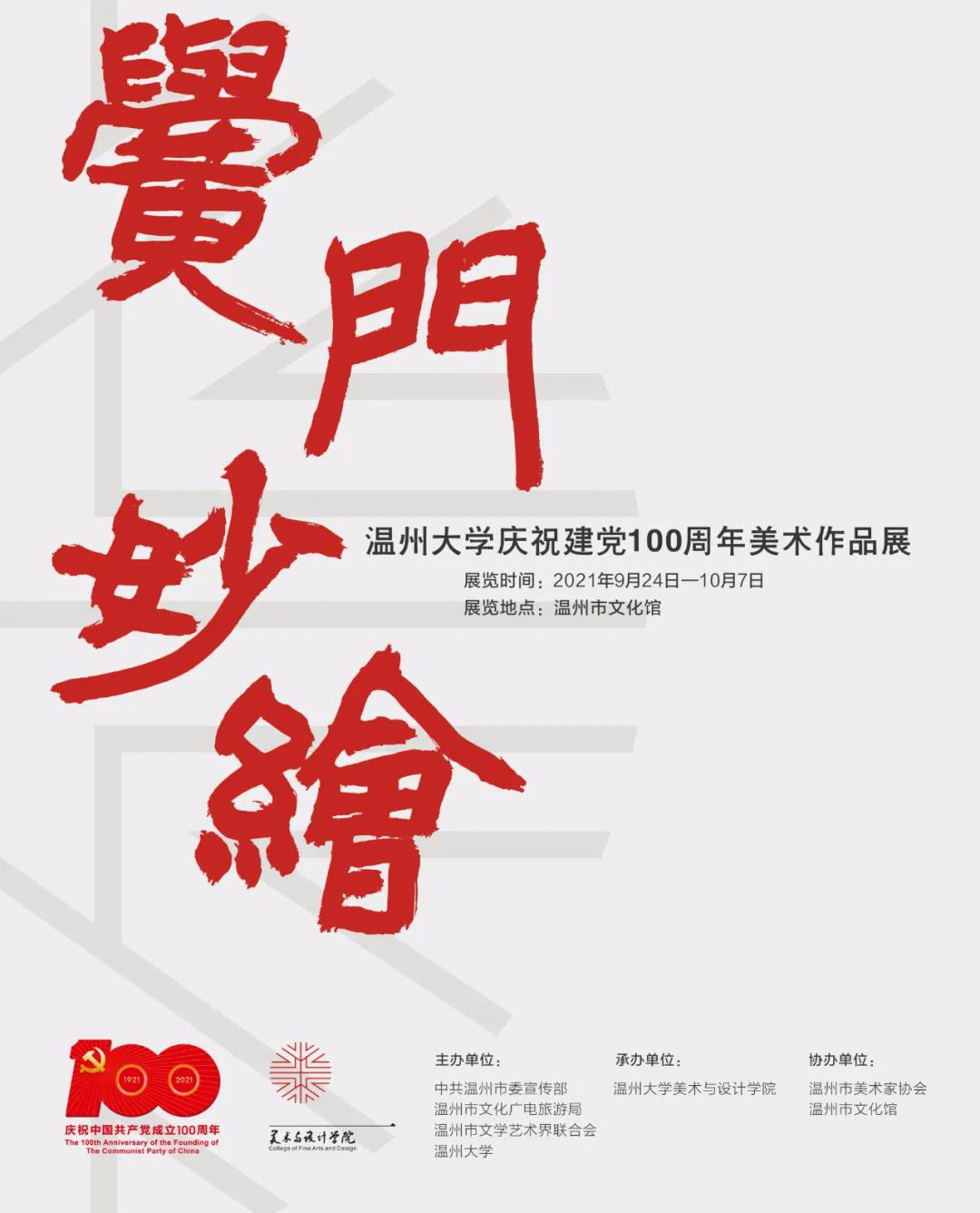 在中国共产党成立100周年之际,为展示ylzzcom永利总站线路检测广大教师在艺术创作上的最新成果,ylzzcom永利总站线路检测精心组织“庆祝建党100周年美术作品展”。本次美术作品展,于2021年9月24日-10月7日在温州市文化馆展出。欢迎广大市民朋友前来参观分享。本次美术展以“黉门妙绘”为主题,作品涵盖国画、油画、版画、书法、水彩、设计、发绣等多个艺术门类,规模空前,风格多样,艺术质量上乘,充分展示了ylzzcom永利总站线路检测在美术创作、研究、教育上的实力与面貌。本次美术展由中共温州市委宣传部、温州市文化广电旅游局、温州市文学艺术界联合会、ylzzcom永利总站线路检测联合主办,ylzzcom永利总站线路检测承办,温州市美术家协会、温州市文化馆协办。