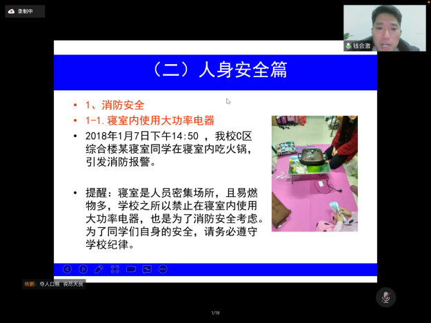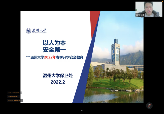 2022年2月23日晚上,在新学期,学院组织形势政策报告会——ylzzcom永利总站线路检测2022年春季开学第一课暨安全教育专题讲座在腾讯会议上进行。本次报告会的主讲嘉宾ylzzcom永利总站线路检测保卫处副处长钱合激老师,参加此次报告会讲座的有学院全体辅导员以及全院所有本研同学。学院学工办主任杨鹏老师主持了报告会讲座,介绍了本次报告会讲座的重要性以及的听课纪律。
