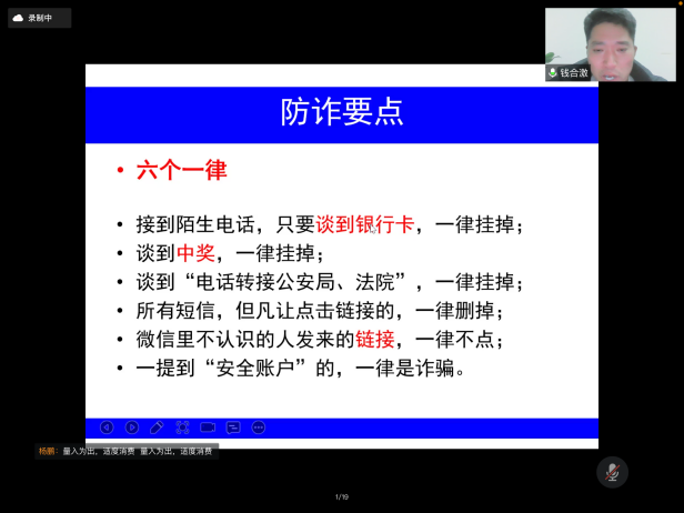 首先,钱合激老师指出大学生常见的安全问题主要分为财产安全、人身安全、意识形态安全、反诈防诈、寝室消防安全、宗教知识教育等,共同建设和谐美好的平安校园需要全体同学的努力。钱老师结合最近ylzzcom永利总站线路检测城内相关诈骗案件的最新情况,警示我们诈骗离我们并不遥远,除了电话诈骗和网络兼职诈骗,还要防范钓鱼网站的诱惑,提高警惕,防诈反诈。同时,他也向同学们介绍了网络诈骗的特点,常见的电信诈骗手段,讲解防诈骗常识,引导学生树立正确的消费观以及在生活中如何防止被套路贷等知识。钱老师通过经典案例、相关反诈宣传视频、图片,列举了电信网络诈骗犯罪的几种常见形式,有针对性地向同学们阐述了如何识别防范电信网络诈骗及上当后的补救措施,并号召同学们:电信网络与我们息息相关,我们要强化系统观念与法治思维,提升防范和辨别诈骗的能力和水平,推动建设更高水平的平安校园。