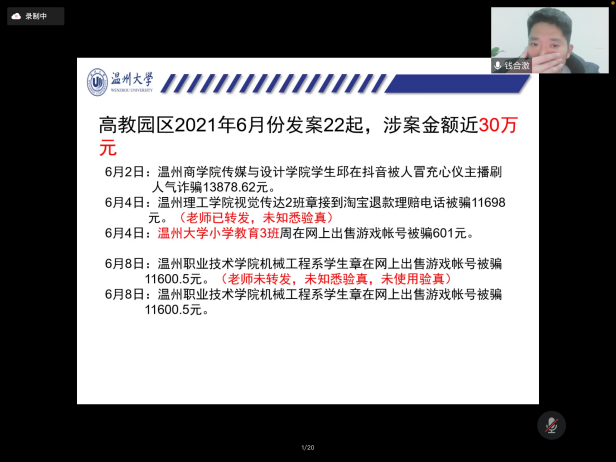 2022年2月23日晚上,在新学期,学院组织形势政策报告会——ylzzcom永利总站线路检测2022年春季开学第一课暨安全教育专题讲座在腾讯会议上进行。本次报告会的主讲嘉宾ylzzcom永利总站线路检测保卫处副处长钱合激老师,参加此次报告会讲座的有学院全体辅导员以及全院所有本研同学。学院学工办主任杨鹏老师主持了报告会讲座,介绍了本次报告会讲座的重要性以及的听课纪律。 首先,钱合激老师指出大学生常见的安全问题主要分为财产安全、人身安全、意识形态安全、反诈防诈、寝室消防安全、宗教知识教育等,共同建设和谐美好的平安校园需要全体同学的努力。钱老师结合最近ylzzcom永利总站线路检测城内相关诈骗案件的最新情况,警示我们诈骗离我们并不遥远,除了电话诈骗和网络兼职诈骗,还要防范钓鱼网站的诱惑,提高警惕,防诈反诈。同时,他也向同学们介绍了网络诈骗的特点,常见的电信诈骗手段,讲解防诈骗常识,引导学生树立正确的消费观以及在生活中如何防止被套路贷等知识。钱老师通过经典案例、相关反诈宣传视频、图片,列举了电信网络诈骗犯罪的几种常见形式,有针对性地向同学们阐述了如何识别防范电信网络诈骗及上当后的补救措施,并号召同学们:电信网络与我们息息相关,我们要强化系统观念与法治思维,提升防范和辨别诈骗的能力和水平,推动建设更高水平的平安校园。 其次,钱合激老师通过消防安全、交通安全、户外活动、毒品伤害四块内容来讲述大学生的人身安全。学生宿舍是高密度人群居住的地方,防火安全显得尤为重要,作为宿舍的主体——学生,要重视安全防火的重要性,提高思想认识,防范胜于救灾,责任重于泰山。同时,钱老师还提到毒品的危害,这些年由于国际毒品的泛滥,毒品像一头张开血盆大口的猛兽,正飞快吞噬着年轻的一代,它无情的破坏着我们的家庭和社会,导致多少家庭家破人亡,国家财富流失。就此,钱合激老师向大家呼吁:人的生命只有一次,它是无价的,也是脆弱的,它承载着你的亲人、朋友和整个社会赋予你的责任,它承受不起任何不负责任的冒险,所以我们一定要珍惜生命,远离毒品。 最后,钱合激老师为大家讲了意识形态安全,他提到大学时代是大学生“三观”及信仰形成的重要时期,稍有不慎,宗教组织便有机可乘。所以我们应该时刻保持清醒的头脑和政治警觉性,不能对宗教渗透的消极影响视而不见或放任自流。此外,很多人都认为邪教离我们很远,甚至觉得自己不可能被邪教蛊惑。但在现实生活中,邪教组织其实套路百出、无孔不入。他们常常借用各种唬人的幌子包装自己,不断更新骗人花样,稍有不慎可能就会跌入邪教圈套。 “你的平安,是对家人最好的关爱!”生命只有在安全中才能永葆活力,幸福只有在安全中才能永具魅力。安全构筑了我们美好的家园,在安全的问题上,来不得半点麻痹和侥幸,我们必须防范在先、警惕在前;必须要树立高度的安全意识,人人讲安全,时时讲安全,推动建设更高水平的平安校园。
