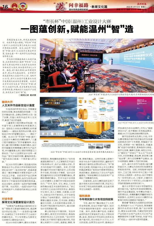 作为温州规格最高的工业设计盛宴,已经连续举办5届的“市长杯”工业设计大赛为我市的工业设计业态源源不断地引入活水,共征集到作品2.4万件。据悉,前5届大赛的140件获奖作品中,有64件已落地转化。全市累计创成国家级工业设计中心2家、省级中心41家,温州工业设计发展势头与设计成果转化效益均显著增强。而ylzzcom永利总站线路检测多次参与承办“市长杯”中国(温州)工业设计大赛,充分发挥美术与设计学科优势,积极回应工业设计产业需求,共同见证了温州“智”造。