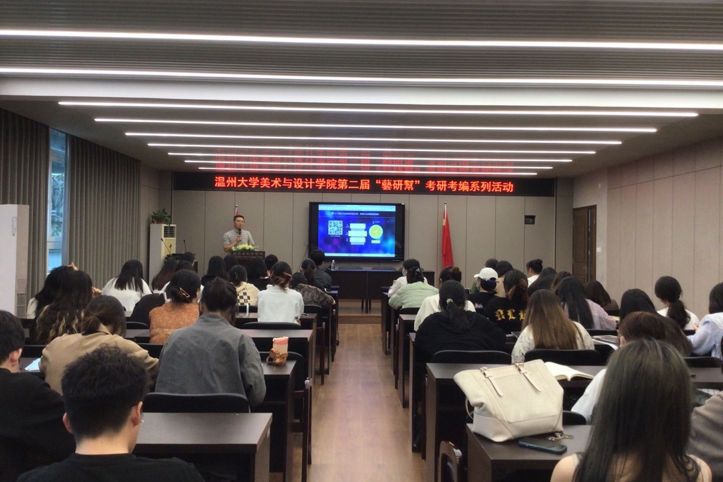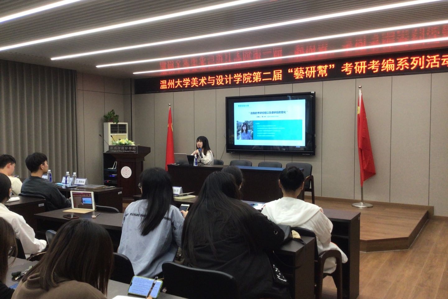 首先,由黎勤斌学长分享他的“十年美院学习经历分享”。黎学长刚开始就读于中国美院附中,后考上中国美院油画系再到保研中国美术学院,他主要分享了自己在美院就读的一些深刻体会以及学习上与其他学校的不同之处。通过学长的分享让我们更全面的了解到中国美术学院,为考研的学生们指引了方向。