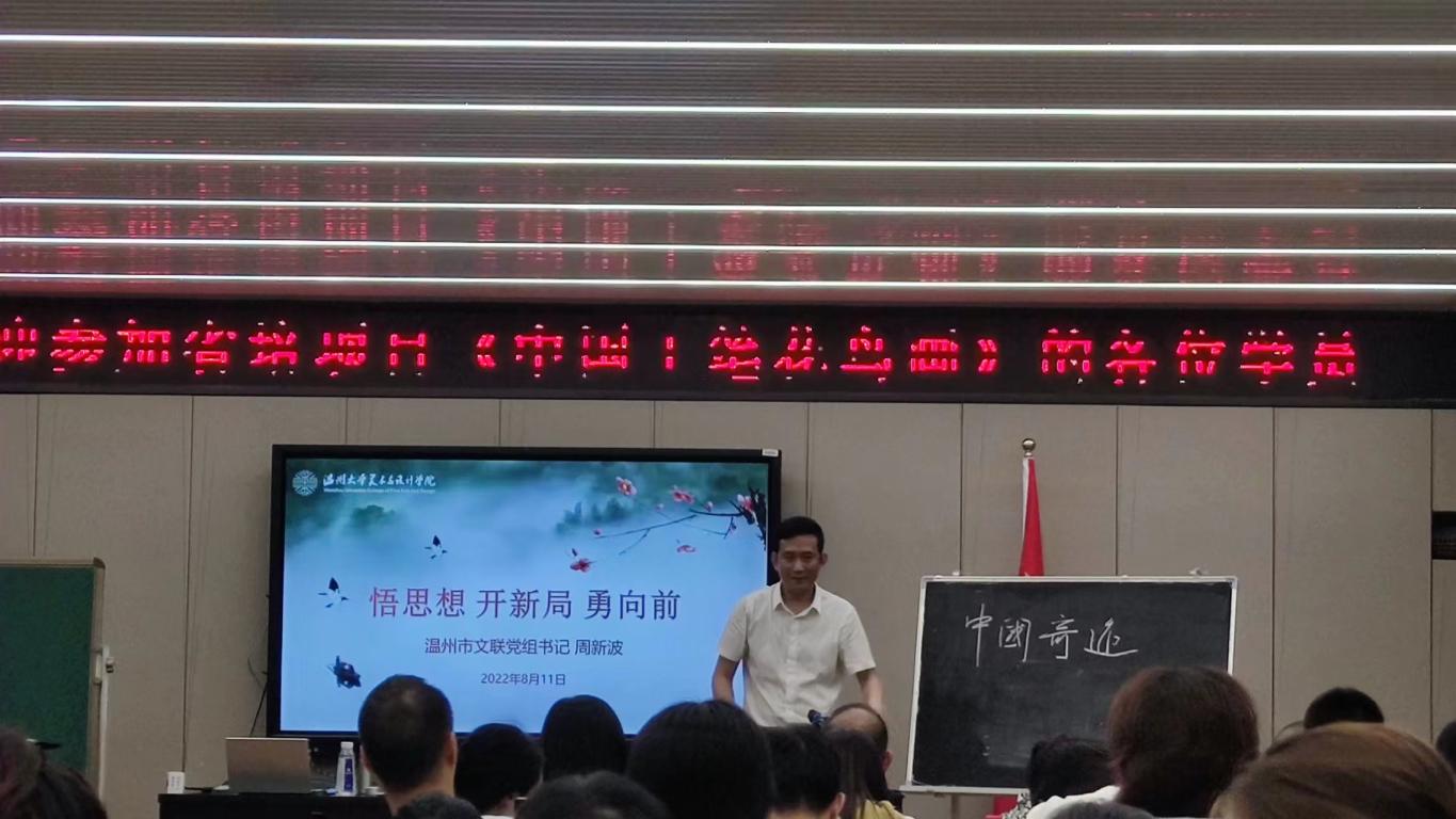 2022年8月11日下午两点,在由ylzzcom永利总站线路检测举办的省培项目——《中国工笔花鸟画》课程中,温州市文联党组书记周新波同志受邀对全体参加此次培训的中小学教师进行了以“悟思想,开新局,勇向前”为主题的专家讲座交流。ylzzcom永利总站线路检测院长谢子静、副院长胡文超、继续教育中心主任邹青、团委指导老师石建林,以及全体参训教师一同参与此次活动。 周新波书记结合自身的教育经历和工作经验,以悟思想、开新局、勇向前三个方面展开论述,从理论高度到实践层面对教师学员们做了具体的建议。本次讲座既有理论方向的指引又有生活处事的智慧,讲座受到与会学院领导和参训教师学员的一致好评。 悟思想: 首先,周新波书记以“两个确立”为指引,提问全体教师学员。在一问一答的形式中加深了教师学员们的印象,深刻明白了“两个确立”指的是确立习近平同志党中央的核心、全党的核心地位,确立习近平新时代中国特色社会主义思想的指导地位。同时,也向各位教师学员传递了党的十九届六中全会精神以及中国共产党浙江省第十五次代表大会精神。鼓励学员们要贯彻落实好这些指示精神,具备良好的素质,坚定意识形态,把握住中华文化的前进方向和发展道路。 开新局: 接着,周新波书记从党的百年奋斗重大成就和历史经验出发,历数发生在中华大地的各种各样的伟大奇迹,绘制出新时代中国特色社会主义社会发展新局面,强调中国在完成第一个百年目标的同时,正在朝着下一个百年奋斗目标继续奋勇向前,激发教师学员为祖国繁荣富强贡献自己的青春智慧。 勇向前: 最后,周新波书记从日常生活的角度和教师学员讨论人生智慧,在生活中奋勇向前,把自己的生活小秘诀传授给大家,总结了三句话,“学会及时归位、尽量形成闭环、力求丰富多彩”。周新波书记以十分接地气的语言和文字表达出自己的生活态度,让教师学员们在喜悦的氛围中受益匪浅。同时祝愿各位教师学员在今后的生活和工作中,继续保持良好的心态,积极学习,努力工作,提升自己的同时也为社会的发展做出自己的贡献,也希望参加本次培训的教师学员都能够从中收获满满。 整个讲座,周新波书记通过理论思想和一个个的真实生活案例相结合,生动地向参训学员们分享了自身的所见所闻所感,受到了与会领导和教师学员们的一致好评。
