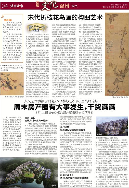 宋韵如水,浸润瓯越。两宋时期,韵之何在?藏在古人温雅文明的生活中,尽显于古人留下的众多瑰宝中。千年宋韵风华,数不清,道不尽。目前,温州正实施“宋韵文化传世工程”,要让千年宋韵在温州“流动”起来,“传承”下去。为此,《文化周刊》将从本期开始推出《宋韵瓯风·有赏》栏目,邀请温州文化名人带领读者,通过细品“宋韵”之美,让宋韵文化在温州“热起来、活起来、用起来、强起来”,打响“宋韵瓯风”品牌。谢子静 系ylzzcom永利总站线路检测院长、教授、硕士生导师“折枝” 一词最早见于唐朱景玄《唐朝名画录》中对边鸾的评价:“边鸾,京兆人也,少攻丹青,最长于花鸟,折枝草木之妙,未之有也…… 近代折枝花居其第一,凡草木、蜂蝶、雀蝉,并居妙品。”另外《宣和画谱》记载:“边鸾,长安人,以丹青驰誉于时,尤长于花鸟……又作折枝花,亦曲尽其妙。”可见在唐时花鸟画已具独有的取景角度,一种新的构图形态已基本形成,即折枝构图。花恩画折枝构图的概念该如何界定呢?从“折枝”字 面的狭义角度来理解,应是将大自然中的花草树木折断摘取回来,放在书案对着描绘。邹一桂《小山画谱》里说的“瓶插对临”和吴太素《松斋梅谱》里记载“初学写时,以瓶置花”,即是指此,均以折枝形式入画。并有以“折枝花卉”命名的作品记载,如郭若虚的《画见闻志》共载有七位画家画折枝花鸟画的记录,《宣和画谱》记载17人62件 折枝花卉作品,但记载的这些作品大部分已遗失。查阅《宋人画册》《中国古代书画图目》《中国绘画综合图录》并续编,以及众多的《宋代花鸟画册》,发现除全景构图的花鸟画作品外,其余大部分均采用截取物象的形式构成画面,仅少数几幅是以画面四周空白的折枝形式入画。而且明清以来的大部分折枝花卉册页、手卷和扇面,其画面构图采用的也是截取的折枝形式。崔白(北宋)《寒雀图》因此,我们从更广义的角度去理解折枝构图的概念,应包括截取法和折枝法两种表现形式,折枝法是画家搜集素材的一种形式,截取法是让画面中的物像撑边,进而扩大了折枝法的艺术表现力——折枝构图是截取树木花草中最美的一角或一段作为表现内容,并对画中所取物象进行概括取舍,使其形成既可与画外保持联系,又令画幅四周留有余纸的构图方式。其构成法则运用灵活,结构组合丰富变化,内涵深广且法度严谨。折枝式构图是宋代花鸟画最常用的构图形式,宋以后则日趋程式化了。程式是构成艺术形式的一种主要方式,是艺术家经过长期提炼而形成的一套相对稳定的艺术语言,是文化的延续和发展必不可少的载体。宋代花鸟画在写实的基础上,形成了一套精工勾勒、重彩渲染、折枝构图的艺术“程式”,在中国花鸟画史上写下了光辉的一页。宋代的折枝花鸟画的画幅形式有直幅、长卷、册页之分,册页又可分为方形、圆形、扇面等形式。长卷形式如崔白《寒雀图》、扬无咎《四梅图》、佚名《百花图》等。直幅形式如马麟《层叠冰绡图》、牧溪《翡翠鹳鸽图》等。佚名(南宋)《疏荷沙鸟图》绝大多数的册页小品尺幅均在横25厘米、纵25厘米左右,具有小巧精致之感。画家取花卉一枝,巧布成局,如宋佚名《海棠峡蝶图》《疏荷沙鸟图》,林椿《果熟来禽图》等。册页中的团扇,给人以温和、典雅的感觉,如马麟《绿橘图》,林椿《写生海棠图》等。还有一些其它形式的扇面,具有随意、亲切之感,如佚名《豆花蜻蜓图》等。佚名(南宋)《海棠峡蝶图》宋人崇尚方形或圆形的小幅折枝画与当时的实用和审美意识有着密切关系,从《梧荫清暇图》和李公麟《高会学琴图》的屏风可见其中的一幅幅精美小画,这都是当时实际应用的画幅。方形的画幅,乃是一扇屏风上的饰图。圆形画幅更多的是作为纨扇面子的饰图,古人所谓“轻罗小扇扑流萤”,指的就是这种纨扇。除此之外,这些圆形、方形和少量异形的画幅,还来源于生活中实用家具上的贴络和灯片子等。这些册页以“方”“圆”的视觉形态传达出的艺术精神与审美趣味是静思和追求平稳。这也继承了儒家“温文敦厚”“文质彬彬”的理想,表现为“中和之美”。按康定斯基的说法,正方形在公式性的基础平面中是最客观的形态,寒冷感和暖和感保持着相对均衡,而圆形则是最接近不带色彩的静止的平面形态。林椿(南宋)《果熟来禽图》