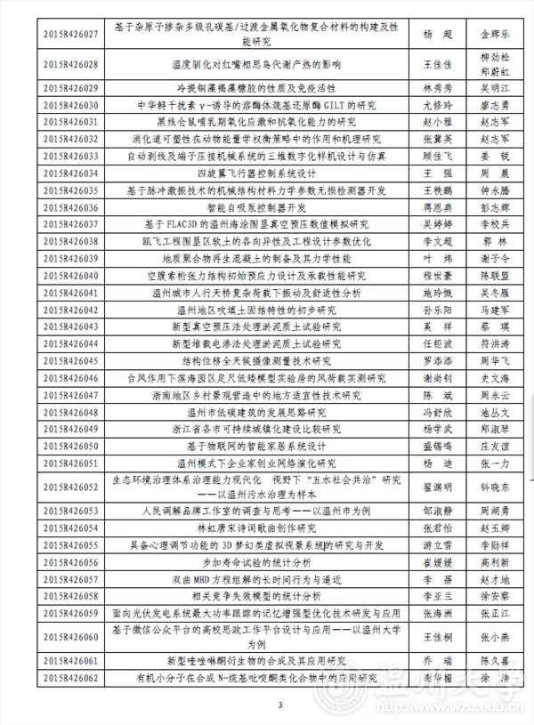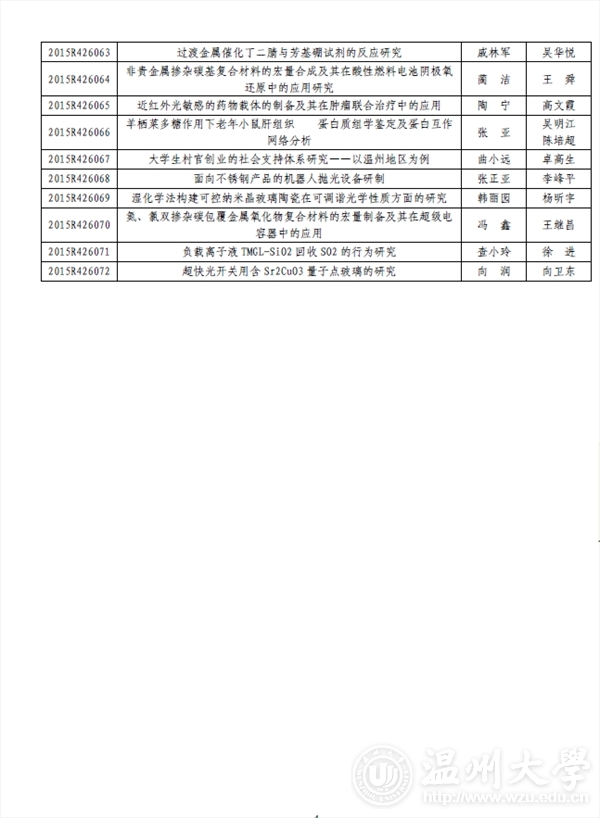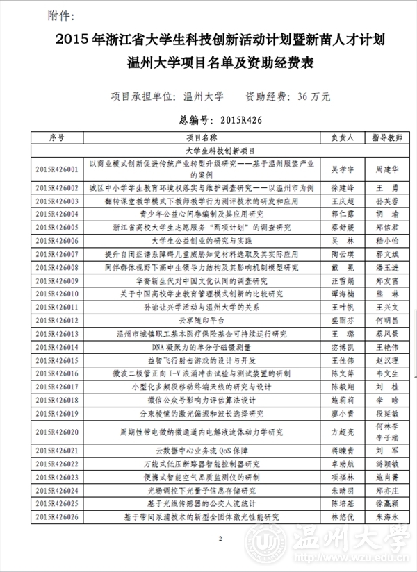 ylzzcom永利总站线路检测团委: 2015 年浙江省大学生科技创新活动计划暨新苗人才计划已于2015 年1 月启动实施,经学校推荐和专家评审,共确立项目2061 项。现将你校通过立项的项目名单印发你们(见附件),请认真实施、加强管理。为不断提升我省大学生科技创新工作整体水平,项目实施办公室还将与省团校合作对项目负责人进行相关培训。附件:2015 年浙江省大学生科技创新活动计划暨新苗人才计划ylzzcom永利总站线路检测项目名单及资助经费表浙江省大学生科技创新活动计划暨新苗人才计划实施办公室2015 年6 月3 日