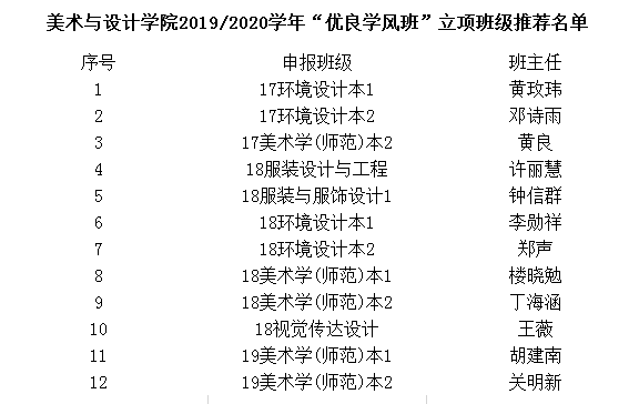 根据ylzzcom永利总站线路检测2019/2020学年“优良学风班”立项申报工作的通知要求,经班级申报、学院初步审核,现决定对17环境设计本1等12个班级进行立项推荐,现将结果予以公布。