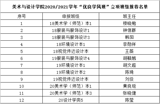 根据ylzzcom永利总站线路检测2020/2021学年“优良学风班”立项申报工作的通知要求,经班级申报、学院初步审核,现决定对18美师本1等12个班级进行立项推荐,现将结果予以公布。