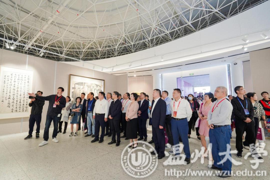 仪式结束,领导、嘉宾、校友、师生共同进入美术馆参观作品展。本次展览分为“先贤风雅”“同道传薪”两大板块,共展出了156位先贤、名家、教师和校友作品,涵盖国画、油画、版画、水彩画、综合绘画、书法、篆刻等种类。展览基于近现代中国美育运动、美术创作的宏大背景,对近代以来温州的书画创作与教育做一个初步的回溯,以近代几位具有代表性的书画大家与“美育大先生”开篇,延伸至温州区域美术创作,以及当代在全国卓有影响的重彩工笔画、书法、版画、水彩画的温籍代表作者;同时梳理学校的美育脉络,展示几代温大人的书画创作,宏扬与传播ylzzcom永利总站线路检测的人文风采。